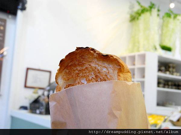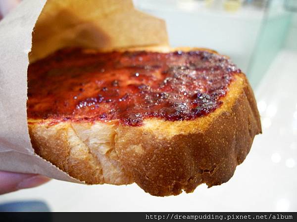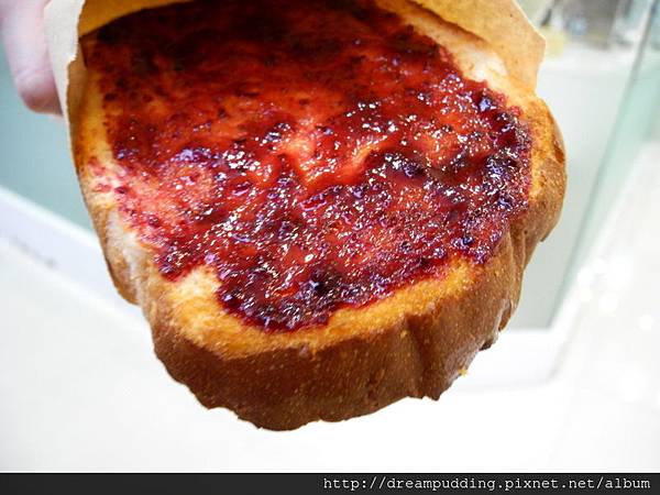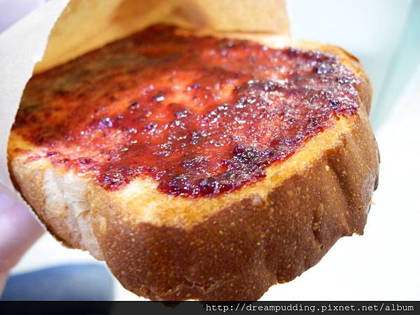 是說這個吐司好好吃!烤的酥中帶柔軟,有著麵包自然的香氣,不會過乾也不硬,微酥的恰到好處,柔軟的帶點棉柔,果醬微酸微甜的。