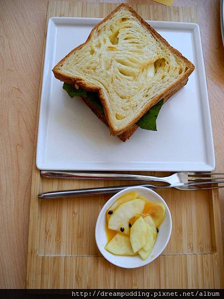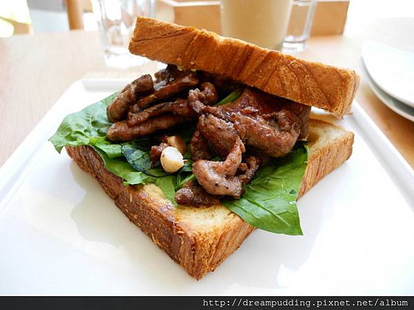 這個烤肉吐司鋪的綠是九層塔,吐司有點像丹麥吐司,整體吃起來很中秋節,是的,很中秋節烤肉的FU。