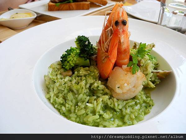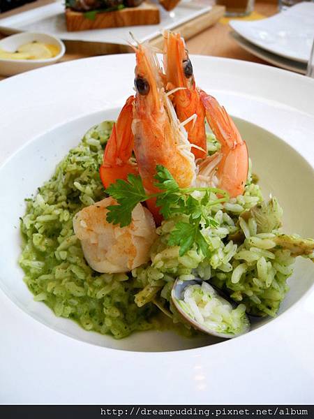 蛤蠣鮮蝦青醬燉飯,NT 328元。