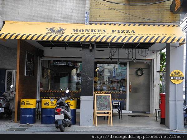 猴子披薩位於大里區的新南路上,黃色的布棚很顯眼,附近的台南溫體牛(這間也好吃)那邊有個大停車場,所以停車也方便。