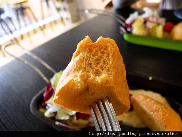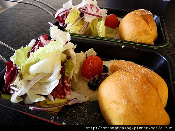 麵包球跟沙拉,沙拉醬微甜潤,麵包球上面撒了起士粉,自然的微鹹,蓬鬆帶點微軟,蠻好吃的。