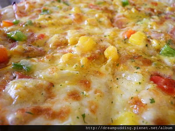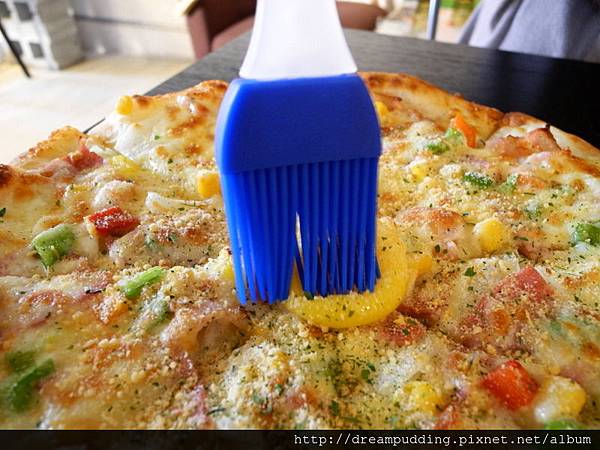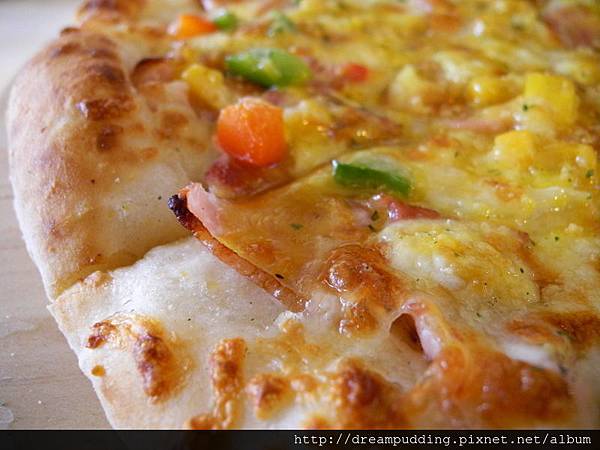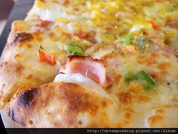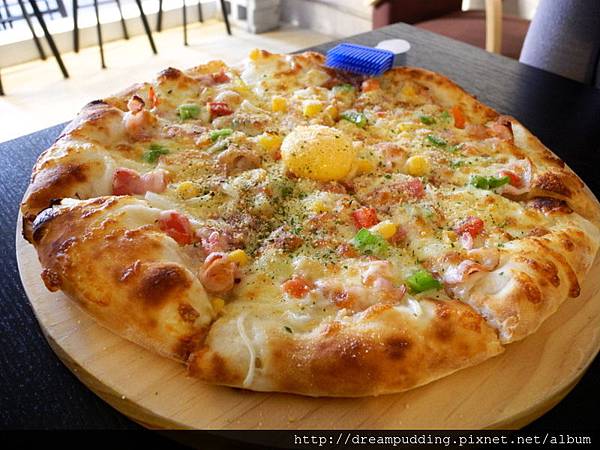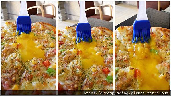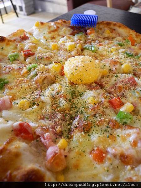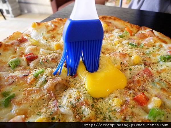 呼,那黃澄澄的濕潤蛋黃讓披薩看起來更可口喔