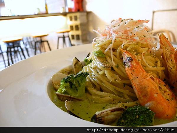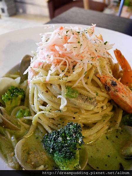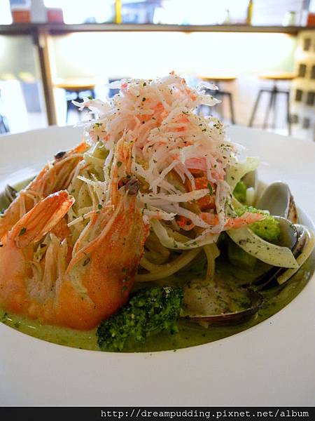 格瑞秘克奶油青醬海蟹腳義大麵,NT 220元。