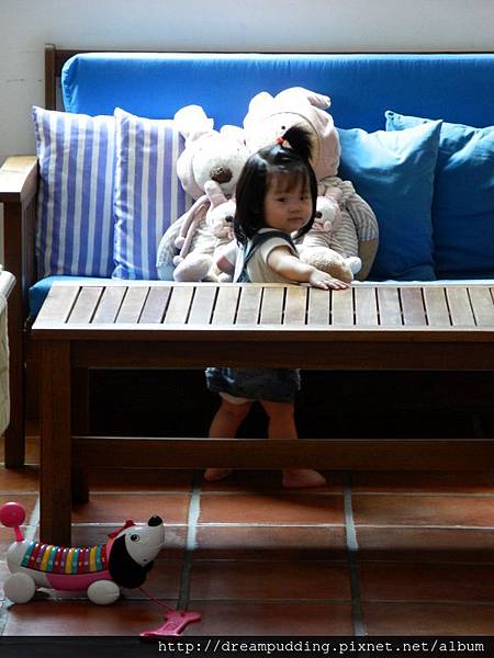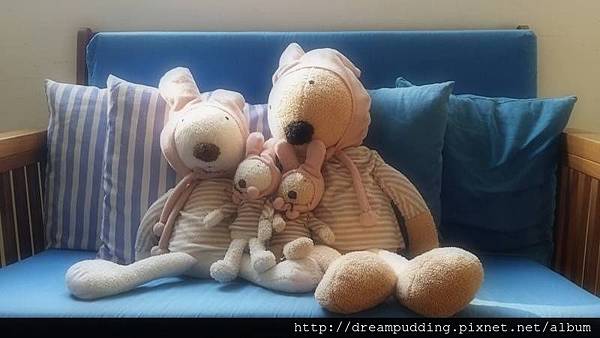我好喜歡這個椅子上的一家人兔娃娃,阿菊一進來就立馬火速的爬行到娃娃家這裡跟娃娃玩。