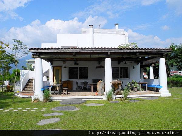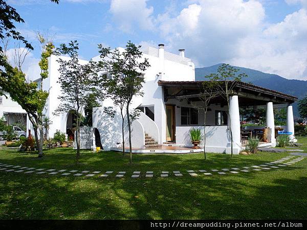 是說,一開車進來我們就都好喜歡這裡,藍天白雲跟綠地,這棟白色建築彷彿跟他們融為一體,好自然的一幅畫。