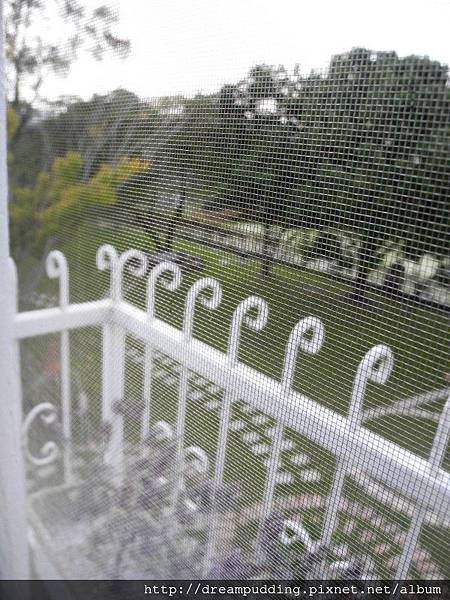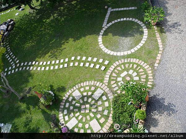 沿著屋外的樓梯往上走,往下望向這一片綠地,看到了那一磚一瓦拚出來的58。