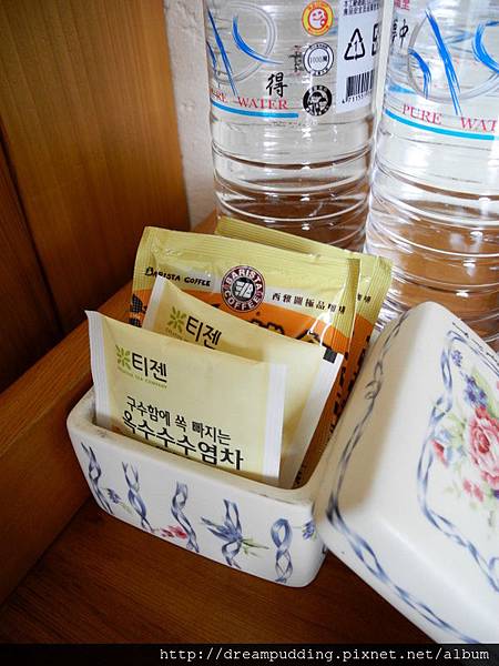 房內都有礦泉水跟茶包,茶包很特別的是韓國的玉米鬚茶包還有西雅圖奶茶包。
