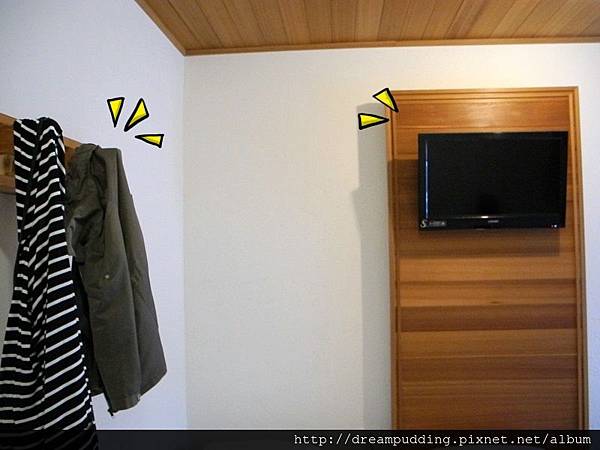 液晶電視也是懸掛在牆上,所以也不用擔心小孩會去翻電視,除了有櫃子能放衣服之外,也有木架能懸掛大衣。