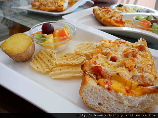 這天的早餐好豐盛,有一塊好大的焗烤燻雞法國麵包,麵包超酥脆的,料也好豐盛,還有地瓜、水果跟洋芋片。