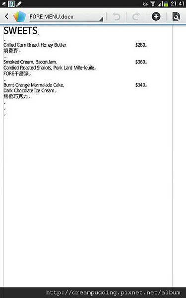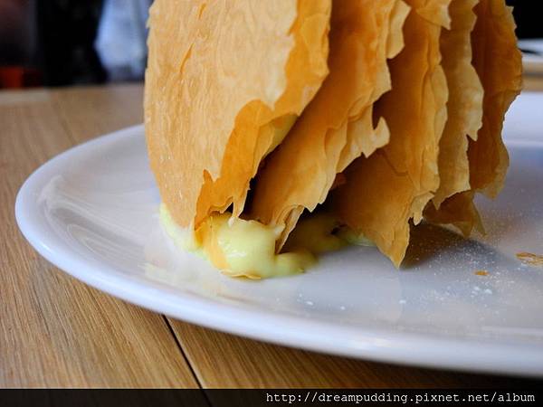 甜點是FORE千層派,這千層派很特別,用豬油下去炸過之後,超酥超脆,內餡是卡士達奶油加了培根及紅蔥頭下去製作,口感鹹甜還有股淡淡的檸檬清香,沒想到中西合璧的如此之好,是一道真的很神奇的甜點。