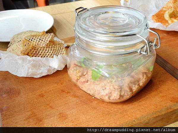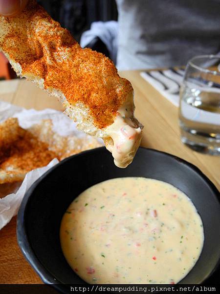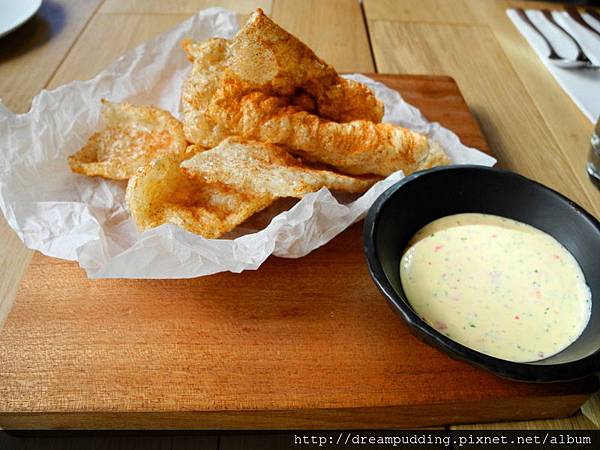 炸豬皮烘乾之後再下去油炸,將油脂全逼出來了,吃起來爽脆,上頭的匈牙利紅椒粉更增添了風味,而這個自製沾醬裡面加了紅蔥頭、美乃滋跟洋蔥,口感十分豐富,讓炸豬皮不再只是炸豬皮,融入了西式料理的華麗風格。
