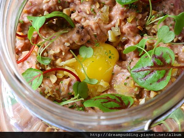 吃之前將其攪拌均勻後,放在芋頭脆片上面一塊吃;脆片很脆,牛肉塔塔口感略Q,口感是清爽的,肉味不會太重。