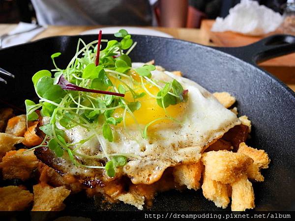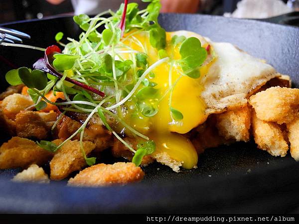 這道有香軟的馬鈴薯塊跟酥脆的麵包丁,半熟的蛋液潤澤著,讓這道菜多了股潤甜的感覺。