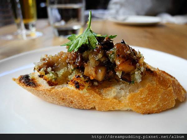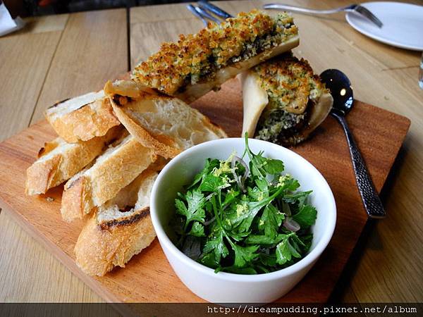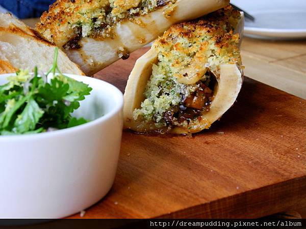 這道很特別,牛骨髓裡面藏有燉牛尾及章魚,撒上麵包粉下去烘烤。