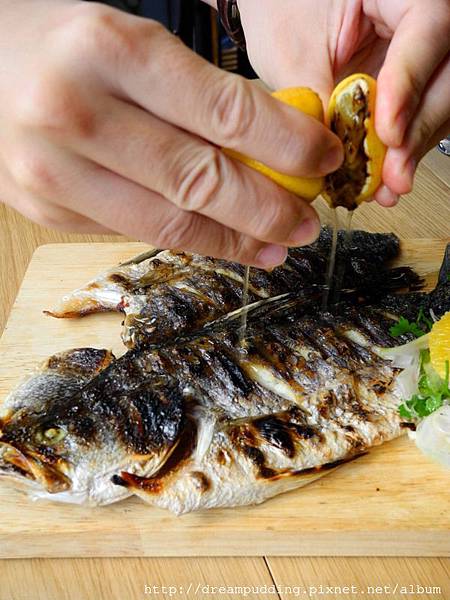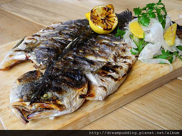 這天的烤魚是海鱸魚,搭配的是烤過的柳橙還有茴香根,採用一夜干的作法,先陰乾之後再烤。