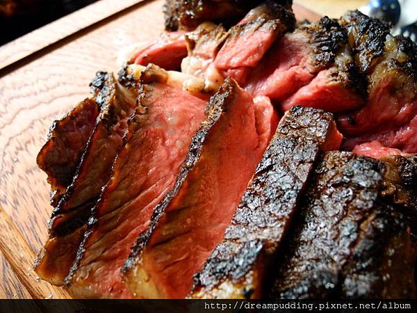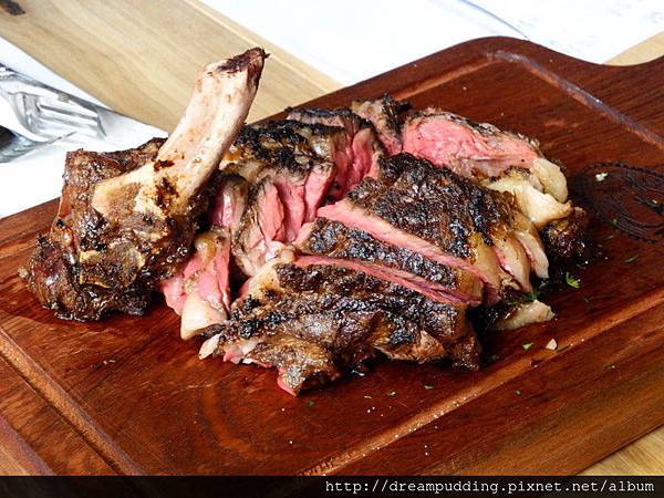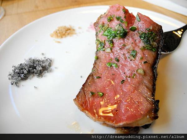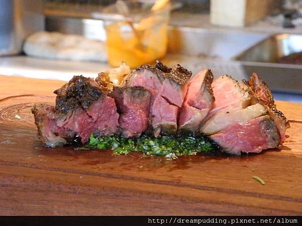 這天吃的是我最喜歡的肋眼部位,底部鋪的是主廚自製醬料,剁碎的蔥蒜及橄欖油,讓牛肉口感更提升,我們都覺得搭配主廚的自製醬料風味就很棒了。