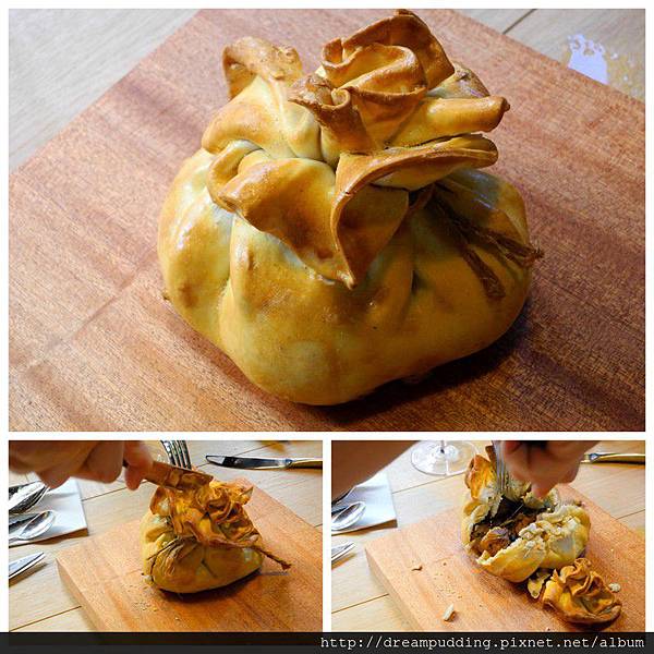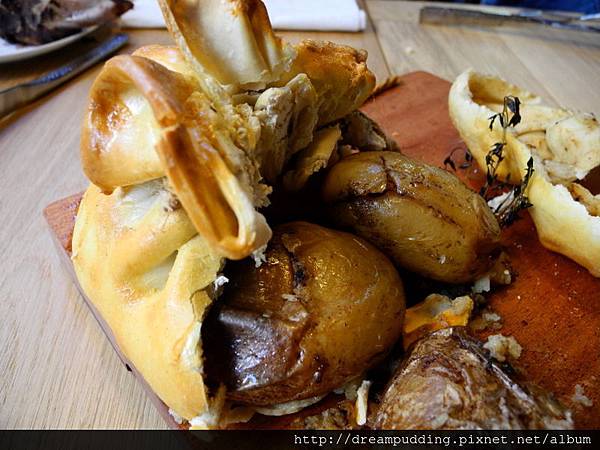 這是麵團加鹽之後包住馬鈴薯做成福袋下去烘烤,這馬鈴薯口感軟熟帶點細微的甜,很好吃!