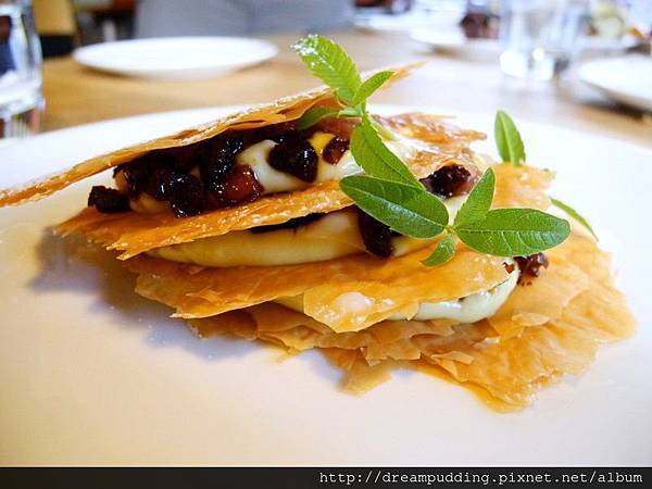 主廚這天用了兩種擺盤讓我們投票,一個是站立的千層派,另一個是平鋪的千層派,我們一致投平鋪的那一款,除了比較美之外,服務生也比較不會那麼辛苦啦,不然端一盤菜都要像上美姿美儀一樣>////<