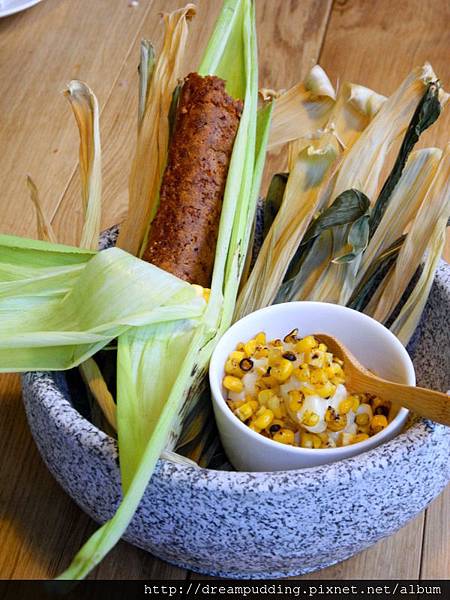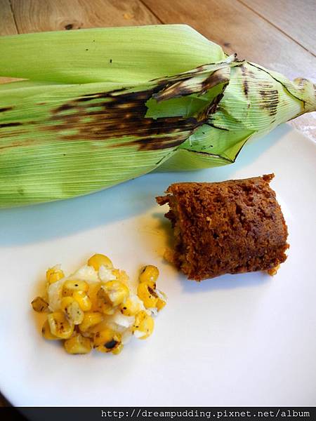 這道特殊的甜點是用玉米下去製作的玉米蛋糕搭配蜂蜜奶油,玉米蛋糕裡添加了小栗米,讓口感多了股糖粒的感覺,配著香甜的蜂蜜奶油一塊吃,還有玉米粒的甜度,這道我好喜歡^^