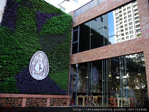 FORE位於美術園道這邊,外觀很好辨識,一面充滿綠意的牆,跟店門口一棵大樹,是全台首家原木燒烤牛排餐廳。