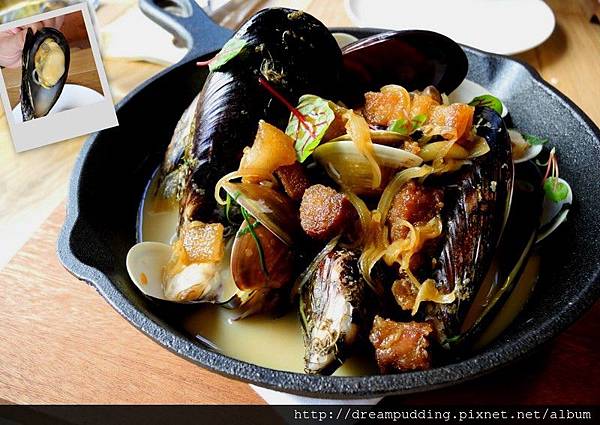 酥炸豬五花/椰香淡菜蛤蠣鍋,這個我很喜歡,除了有蛤蠣跟淡菜的鮮甜之外,還有我最愛的酥炸豬五花,淡菜碩大飽滿,豬五花Q中帶脆,還加了香茅跟檸檬,醬汁鮮甜濃郁之外還有股清香,我們還有拿麵包來沾它吃。
