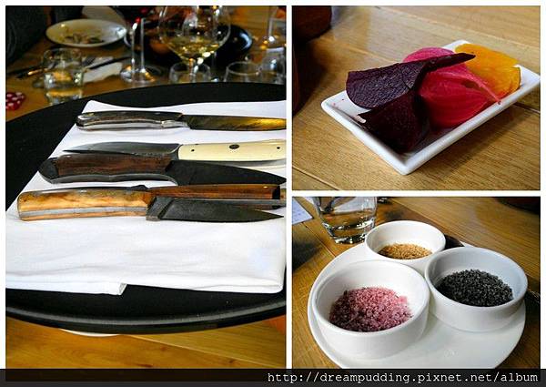 在牛排上桌前會先送上牛排刀讓顧客挑選,這刀真的超鋒利的,切肉要注意別太大力喔!而圖右上方是醋漬三色的小甜菜根,是用覆盆子醋、蘋果醋和香檳醋下去醃製的,吃起來很爽口解膩;右下方則是牛排佐料鹽:紅酒鹽、木炭鹽跟梅林辣醬鹽,搭配每種鹽都是不同的風味。