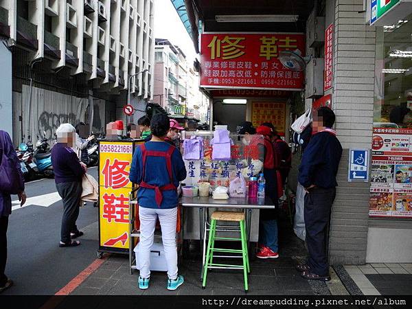 然後一直走,會過一個有紅綠燈的路口後再往前走會看到一間7-11,在這個巷口有一攤麻糬在修鞋的旁邊,然後一堆人在排的,這一個攤販就是不老客家傳統麻糬。