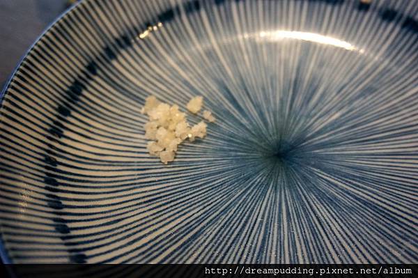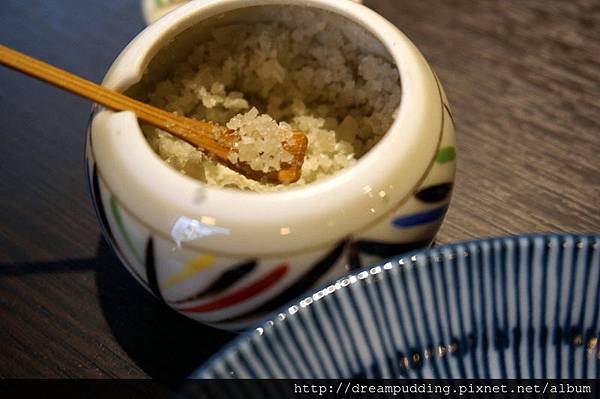 而在烹煮過程中,服務人員會介紹桌上這瓶法國灰鹽,它跟法國鹽之花來自同一產區,原始未經過後面的人工添加,所以吃起來有股很自然地鹹甘味,服務人員說如果喝湯覺得湯味道不夠,可以將湯舀到碗中加入少許灰鹽,味道會更加不同;可不要將灰鹽加到正在煮的湯鍋中,因為當用餐完畢,那鍋中剩餘的湯是要用來煮黃金一品粥的,若是加入灰鹽會讓口味變得偏重。