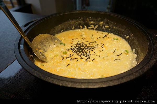 當鍋內食物都吃完了之後,就要用剩下的湯精華來煮粥啦!一起煮粥的有黃澄澄的蛋、蔥花、蝦卵跟海苔絲及干貝絲。