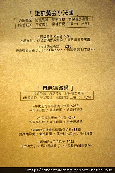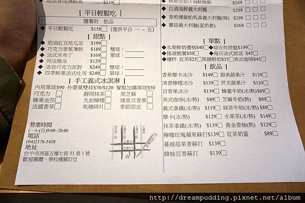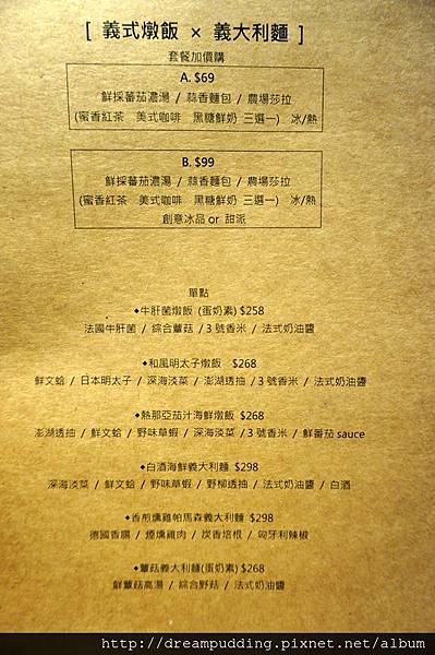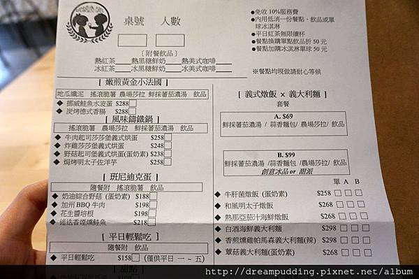 點餐的MENU,種類算蠻多的,早午餐大部分都是有附飲品的套餐,義大利麵跟燉飯則有單點跟A、B套餐的選擇,此外還有手工義式冰淇淋,如果有不清楚地可以詢問服務人員,他們都會很親切地回答^^