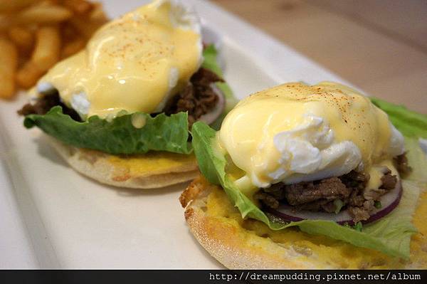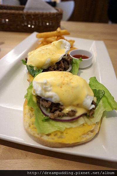 班尼迪克蛋,加州BBQ牛肉,NT 198元。附脆薯、跟飲品。