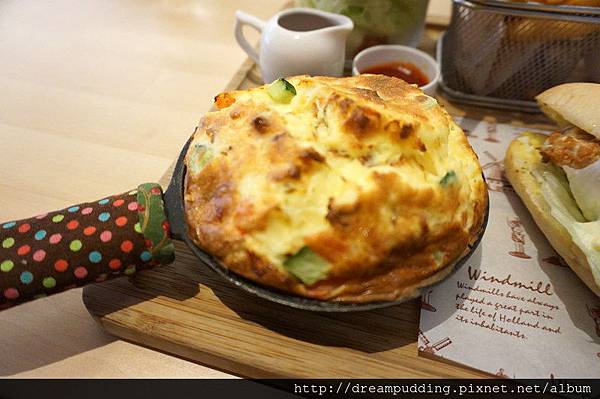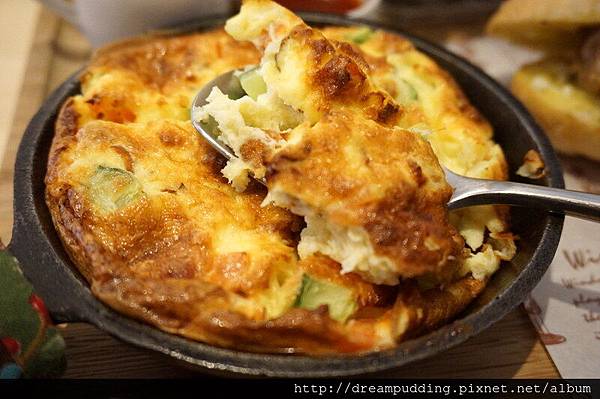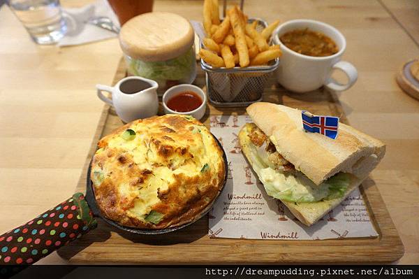 我的風味鐵鑄鍋,炸雞莎莎堡義式烘蛋,附脆薯、沙拉跟濃湯還有一杯飲品,NT 248元。