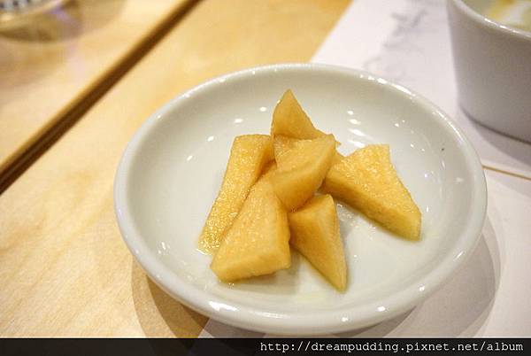 開胃小菜都是老闆自個醃的,醃蘿蔔爽脆可口,微酸開胃。