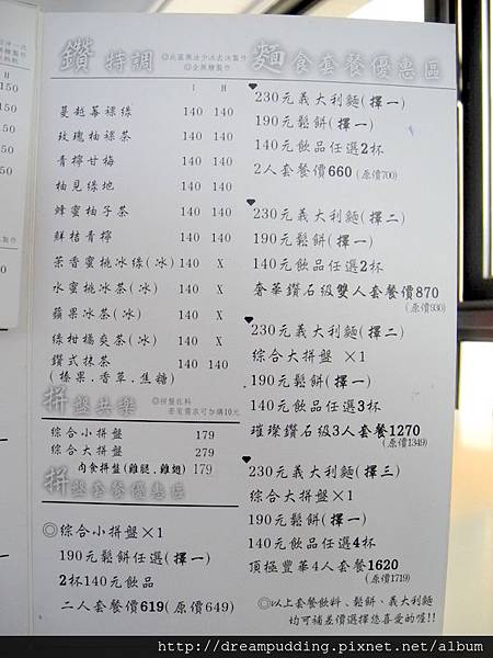 我們恰好3個人,所以點了璀璨鑽石級三人套餐,可以選擇230元的義大利麵2份、大拼盤1份、190元的鬆餅一份、還有3杯140元的飲料,超過再補差額即可。
