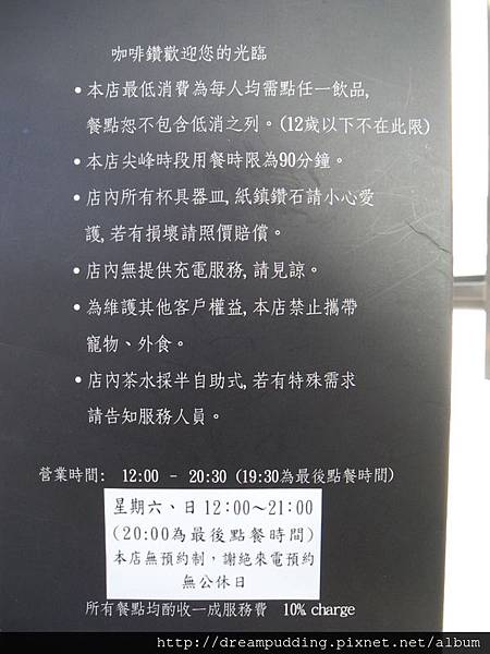 MENU寫著一些基本事項,咖啡鑽有低消喔,一人要點一杯飲料,但12歲以下小朋友就沒有限制。。