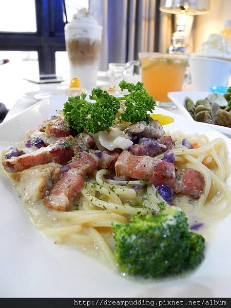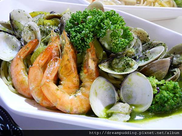 羅勒鮮蝦蛤蠣義大利麵(青醬),青醬的味道也挺不錯的,蛤蠣跟蝦子都有新鮮。