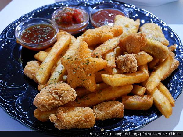 炸物拼盤裡有很多種類,數星星、雞米花、薯條,沒記錯的話好像還有起士條?搭配的醬有莎莎醬、糖醋醬跟番茄醬,炸物的火侯掌握的棒,吃起來外酥內卻不油膩,是好吃的炸物。