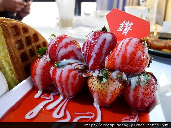 草莓有精選過的樣子,每一個都是大顆飽滿,還淋上香甜的煉乳。
