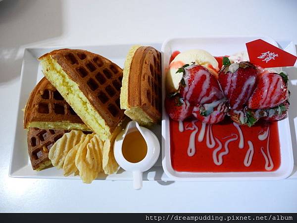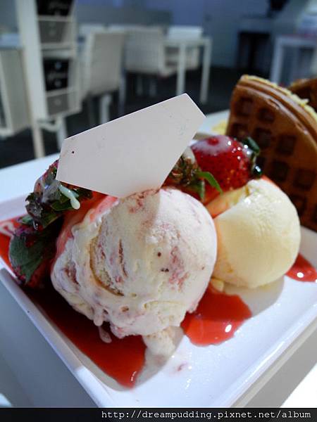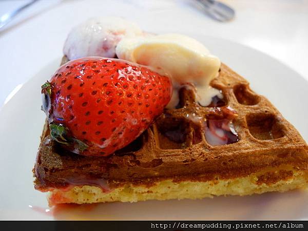 最喜歡的吃法就是把冰淇淋跟草莓還有蜂蜜一塊放在鬆餅一起吃,不過這次吃覺得跟以前第一次吃的時候有點不一樣,外皮也是一樣略酥,內部柔軟,但印象中沒有前兩次吃到時來的驚艷,不過也是好吃的鬆餅啦。