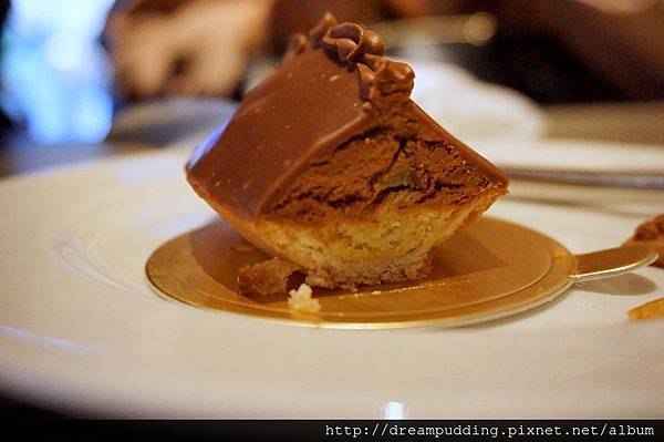 底部是略緊緻帶點細微濕潤的蛋糕體,外層是微硬的巧克力,裡面是巧克力加栗子果肉,吃起來不會太甜,巧克力也不苦,甜度跟濃郁感都適中。