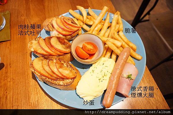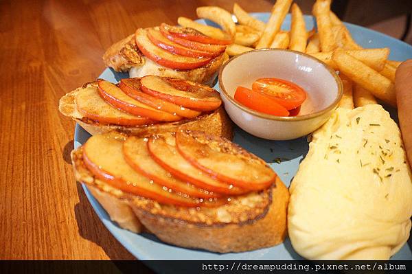 友人點的是小圓法式吐司肉桂蘋果口味,NT 230元。有三塊鋪滿蘋果塊且切片裹上蛋液煎過的的法式吐司,還有炒蛋、德式香腸跟煙燻火腿,沙拉部份我們換成了脆薯,脆薯還蠻好吃的,酥酥的且不油膩。