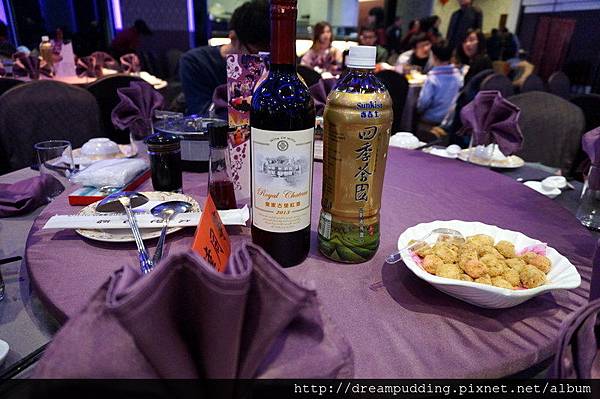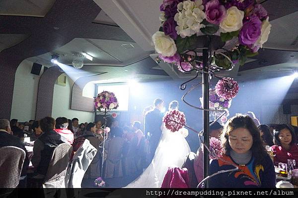 會場布置使用了大量的紫,桌巾也是紫色的,優雅又浪漫。