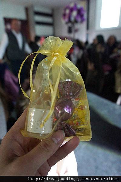雖然坐在紅毯旁邊,但我沒有搶到婚禮小物,這是帥氣的諭仔拿到的,是小香檳吹泡泡喔。