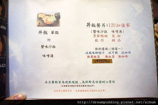 丼飯單點就有附蟹味沙拉跟味噌湯,加120元可升值套餐,會多了季節醋物、蒸物、飲料跟甜品。