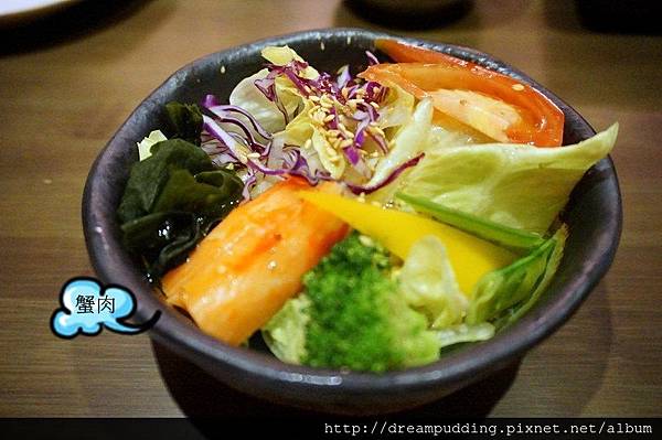 蟹味沙拉有蟹肉棒,沙拉新鮮清脆,和風醬汁清爽開胃。