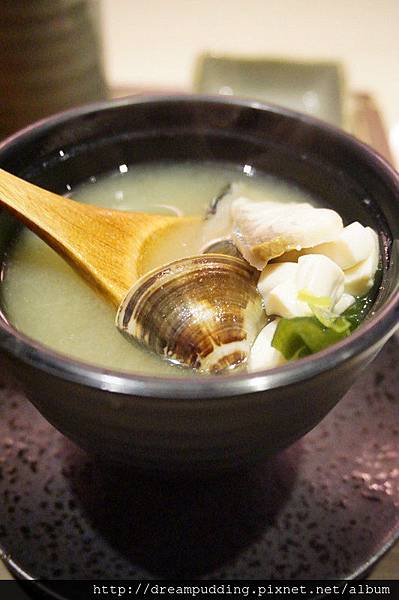 味噌湯濃度恰到好處,裡面有滿滿的料,軟嫩的大片魚肉跟飽滿鮮甜的蛤蠣還有嫩滑的細小豆腐塊。