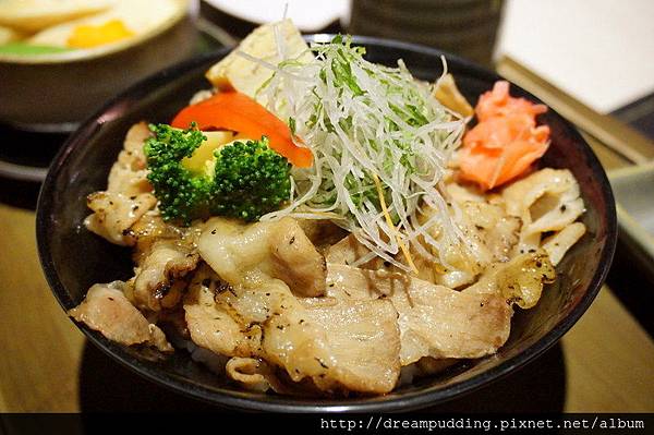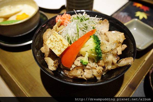 晶瑩的米飯上鋪了滿滿的加了日本紫蘇鹽下去炙烤的特選黑豬梅花肉,搭配一些漬物跟青紫蘇絲與蘿蔔絲,解了黑豬梅花肉可能有的膩,肥潤適中,整體不感厚重。