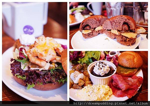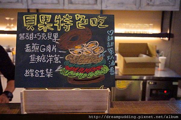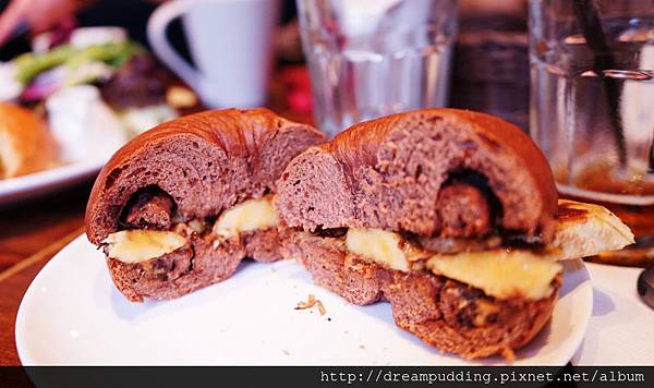 貝果也是新菜單之一,因為是手工製作,所以分量有限,每次口味也不一定一樣喔!而貝果特色吃是店內的一項餐點,是鹹口味的貝果,搭配內容會不定期更換,會畫在吧檯的小黑板上,我們這天吃的是巧克力貝果搭香煎雞肉片還有焦糖洋蔥,光是聽到焦糖洋蔥我的內心就開始澎拜了(灑花)