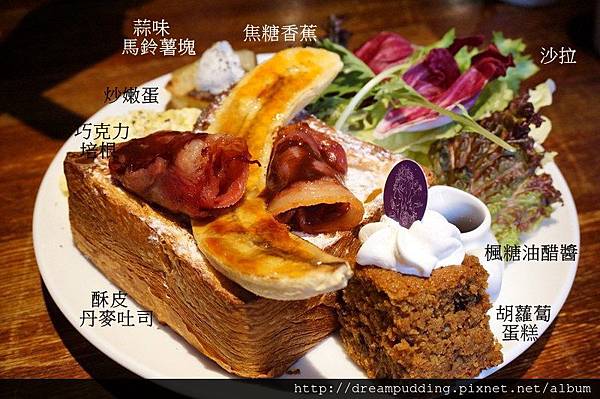 一整盤非常豐盛,有一大塊吐司、巧克力培根、焦糖香蕉、炒嫩蛋、蒜味馬鈴薯塊、楓糖油醋醬沙拉跟甜點胡蘿蔔蛋糕,主食跟蔬菜還有水果跟蛋類甚至甜點都兼顧到了。