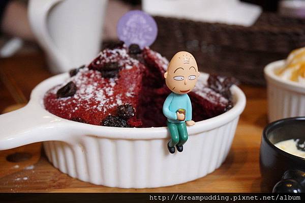 紅絲絨熱蛋糕加了許多大顆的葡萄乾,外皮有著細微且薄的酥感,內部蓬鬆帶點微微的濕潤跟細細微的軟,吃起來微微的甜,加入奶油乳酪會讓口感變的濃郁,加入野莓醬會多了股酸甜,加上冰淇淋當然是又冷又熱的刺激感啦>////<